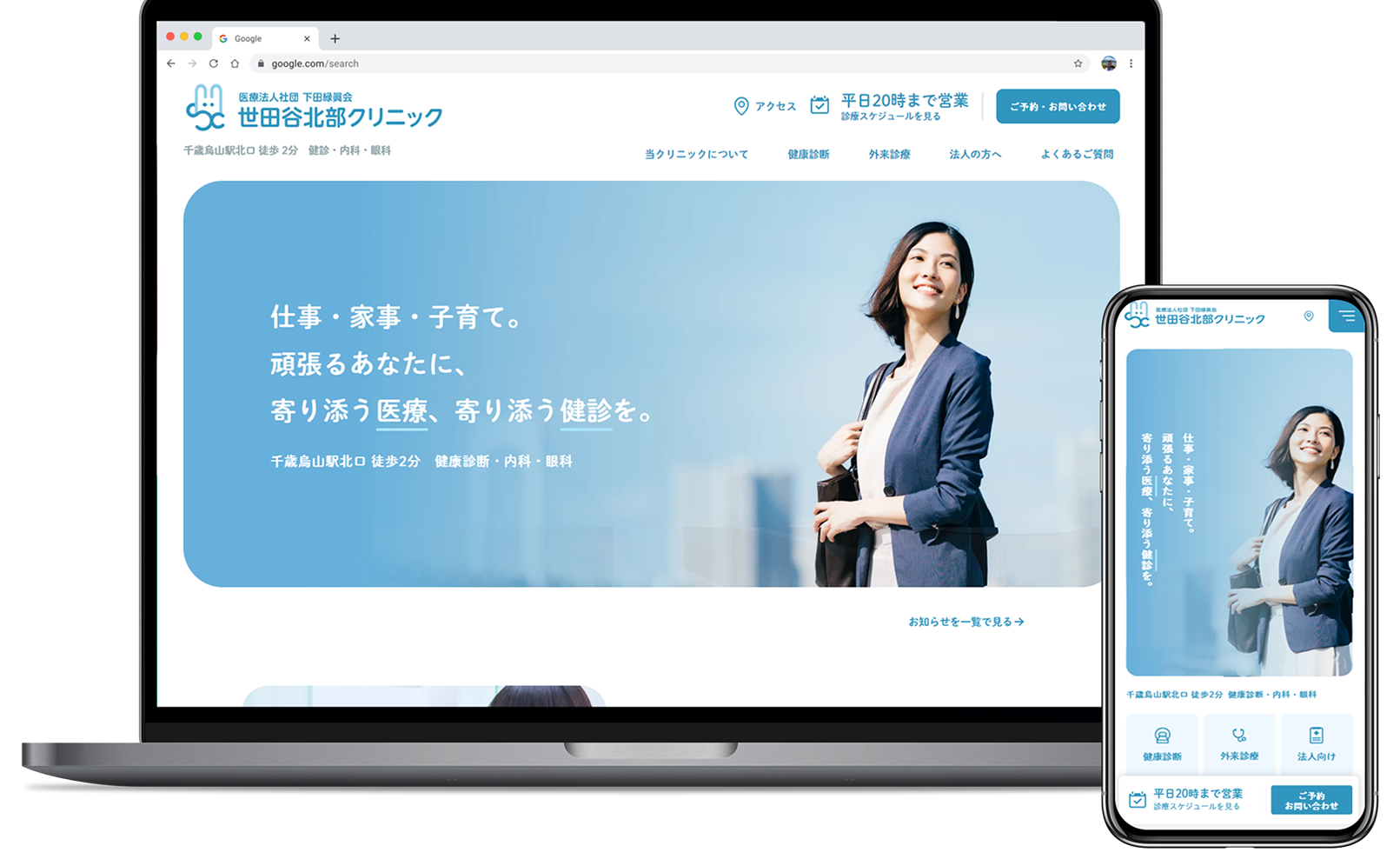 クリニックの新規開設にあたり、若い世代の方々にも親しみやすく、診療内容や検診情報をわかりやすく伝えられるホームページを作りたいと考えていました。地域密着型の医療機関として、アクセスの良さや気軽に受診できる雰囲気を伝えることも重視しており、+Design部に制作をお願いしました。